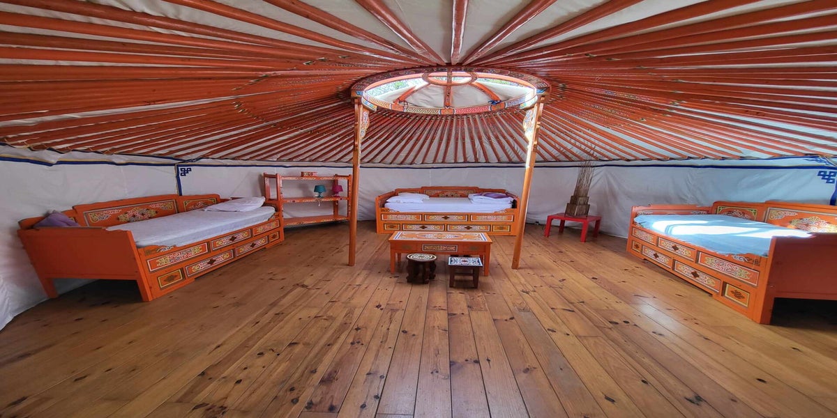 La yourte familiale possède un lit double de 140cm et deux simple de 80cm. Avec son mobilier venant tout droit de Mongolie, cette yourte saura vous assurez une dépaysement totale.